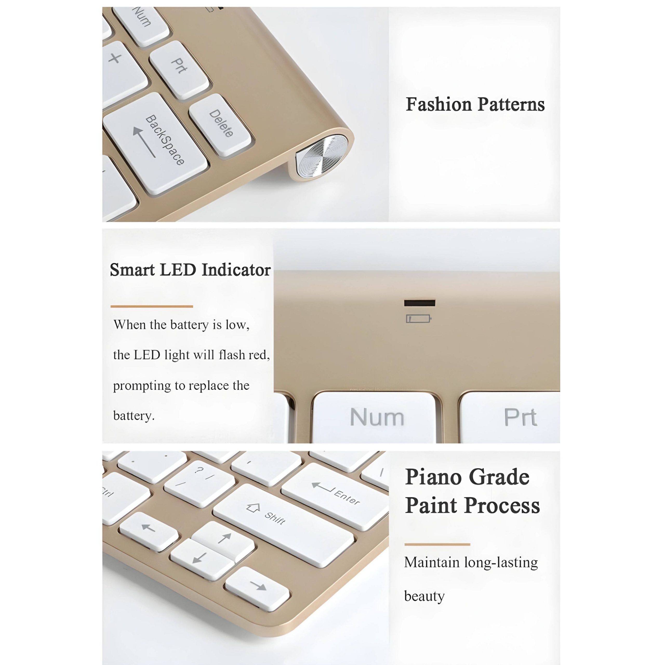 The Kitcheniva 2.4G Mini Wireless Keyboard and Mouse Set in Gold is designed for users seeking a compact, efficient desktop solution. It features a stable 2.4G wireless connection with a USB receiver that supports both keyboard and mouse, offering a range of up to 33 feet. The keyboard includes low-noise keys and 12 multimedia shortcuts for seamless control over media and applications, while the ergonomic mouse ensures comfortable use. Constructed with durable materials, this set is compatible with Mac and PC systems, providing a reliable accessory for everyday computing tasks.