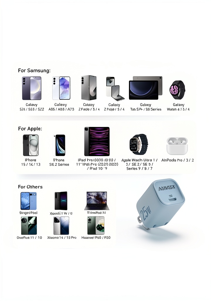 - Rapid 25W charging for Samsung devices, significantly cutting down charging times.