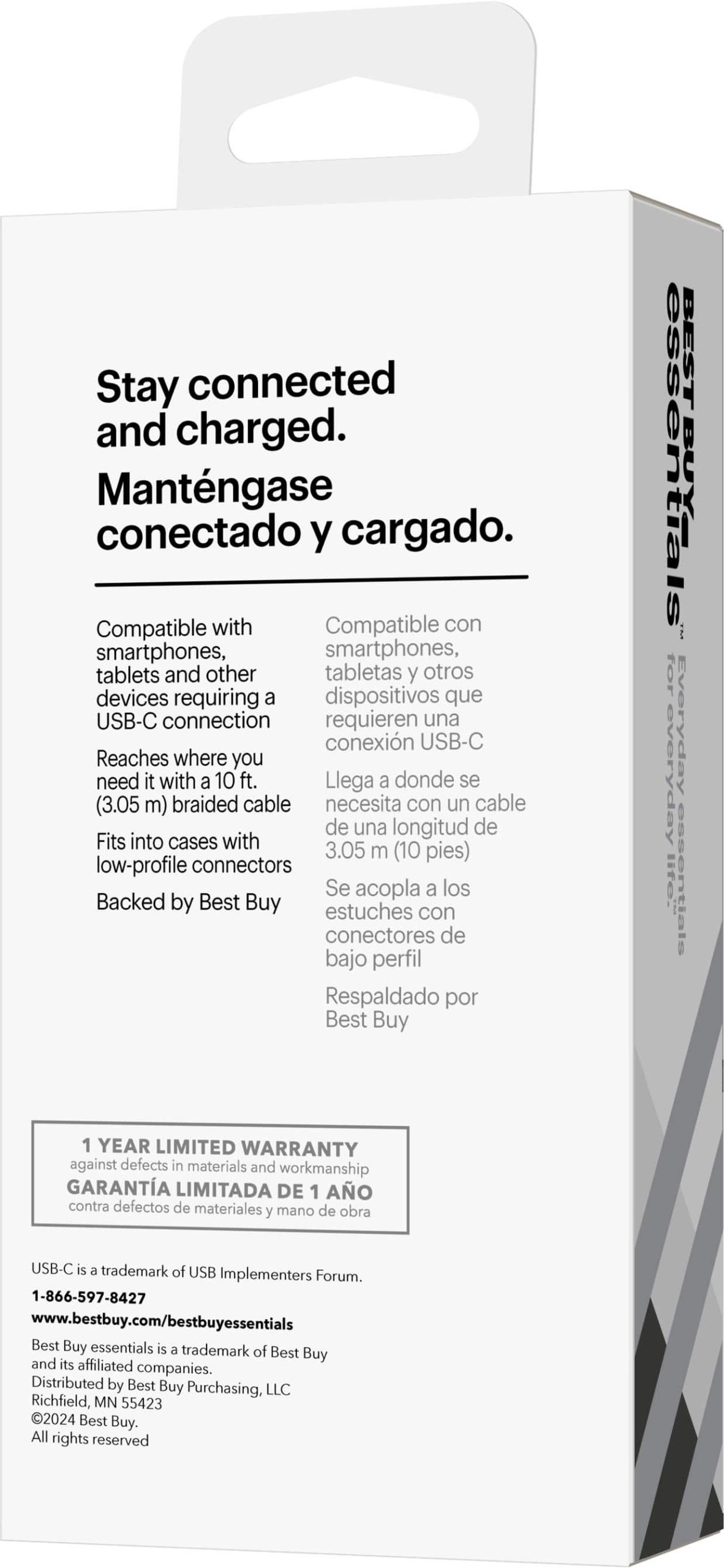 Best Buy essentials products are designed to deliver dependable tech support at an affordable price. This USB-C cable stands out with its USB-IF certification, ensuring it meets industry standards for safety and performance. The braided construction enhances durability, reducing the risk of fraying, while the 10 ft length provides flexibility that shorter cables lack. Backed by Best Buy’s reputation, you receive a quality accessory that reliably powers and connects your devices day after day.