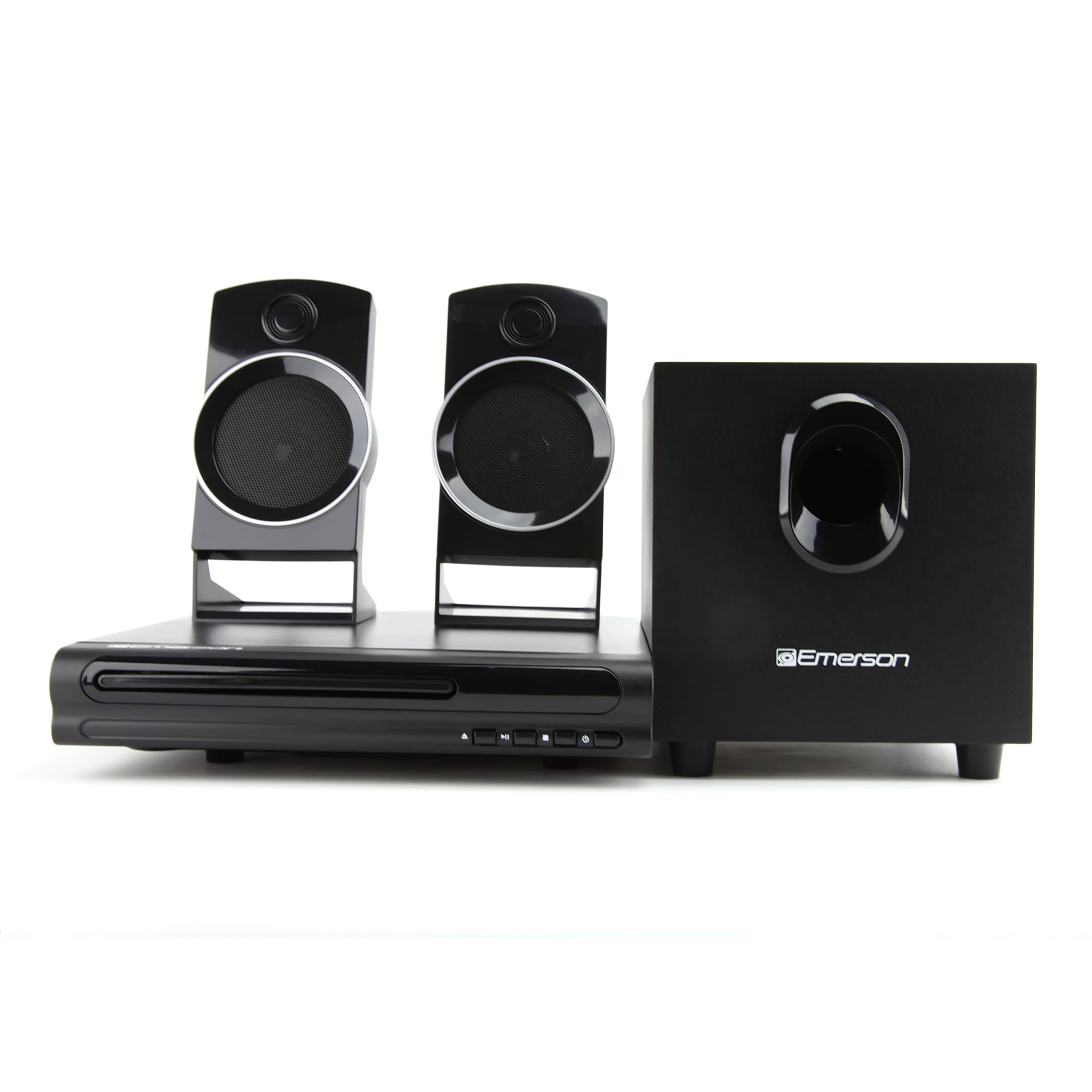 The Emerson 2.1 Channel Home Theater System delivers powerful audio with a built-in DVD player, subwoofer, and dual speakers for a complete entertainment setup. Enjoy crisp surround sound for movies, music, and games in your living space. Easy to set up and compatible with various devices for versatile use.