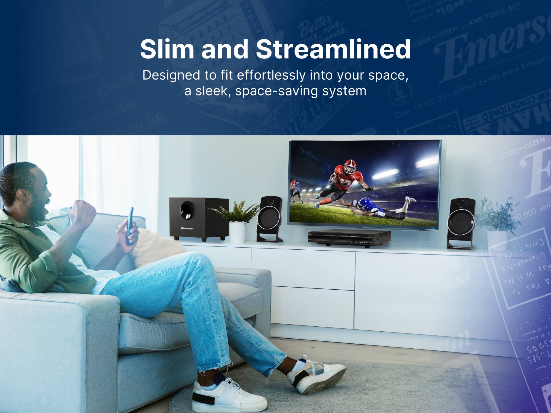 Emerson Home Theater System setup in a modern living room
