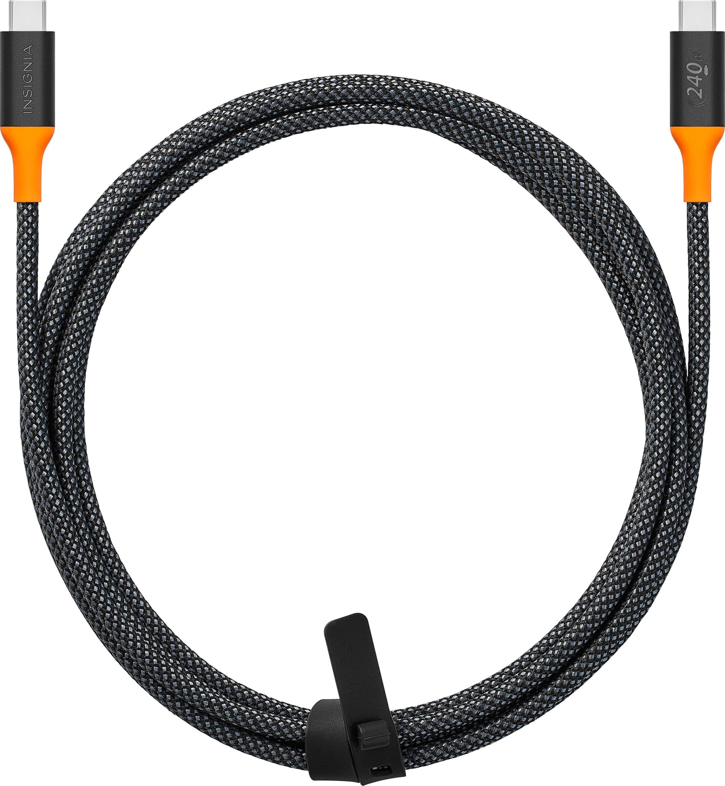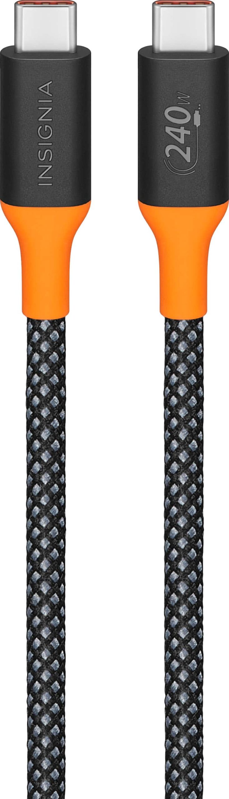 The Insignia 8 ft. 240W USB-C to USB-C Charge-and-Sync Braided Cable is engineered for high-performance charging and data transfer, supporting up to 240W with Power Delivery to rapidly charge devices like laptops, tablets, and smartphones. It features a robust braided cable jacket that resists wear and tangling, extending its lifespan, and includes USB-C connectors on both ends for universal compatibility. With a data transfer speed of 480 Mbps, it ensures efficient syncing of files and media, while the 8 ft. length offers ample reach for various setups. The product comes in FSC-certified sustainable packaging, reflecting a commitment to environmental responsibility.