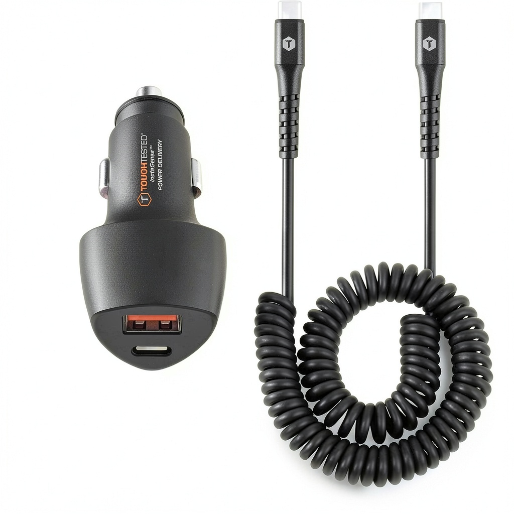 The ToughTested 20W Vehicle Charger is designed for reliable power on the road, featuring a coiled 6-foot USB Type-C to USB Type-C cable that offers flexibility without clutter. It includes 20W USB Type-C Power Delivery and QC 3.0 USB Type-A ports, supporting rapid charging for devices like Samsung Galaxy, LG, and Motorola phones. Crafted with durable materials, this charger incorporates charge protection circuitry to prevent overcurrent and short circuits, ensuring safe operation. It is compatible with a wide range of USB Type-C and USB-enabled devices, making it an essential accessory for modern travelers.