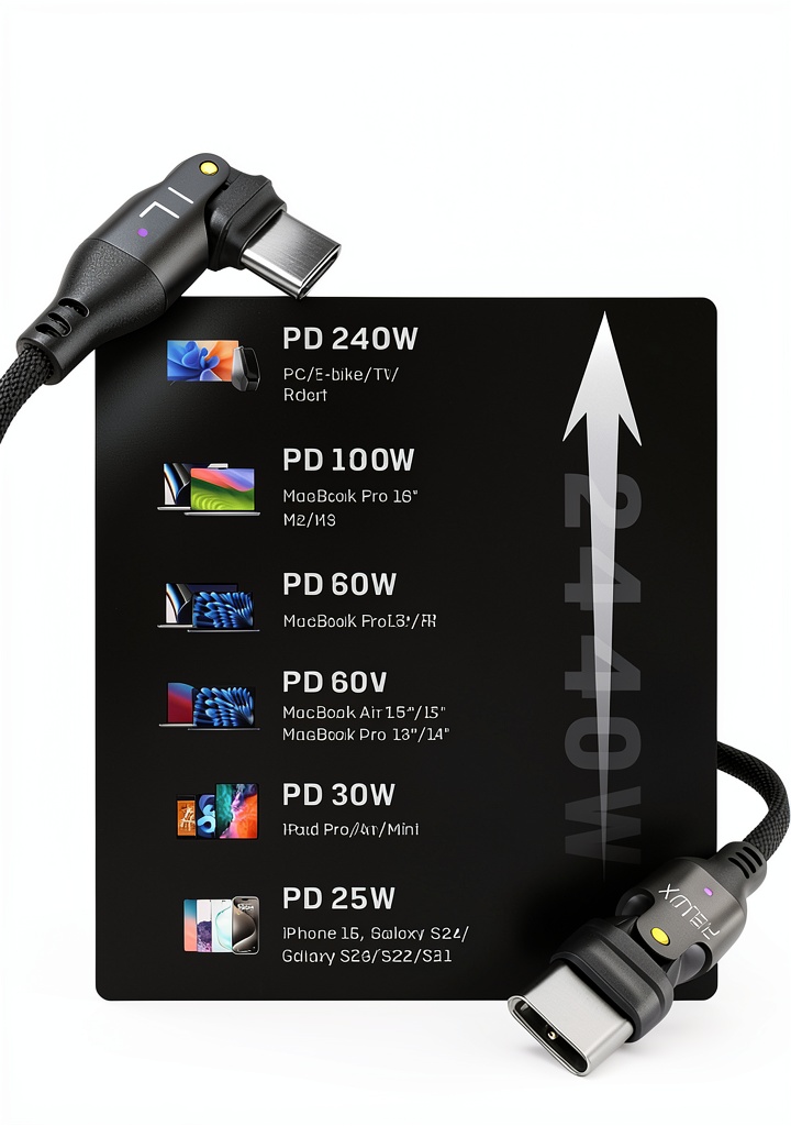 This cable works with all USB-C devices, including laptops, smartphones, tablets, and accessories that support USB-C connectivity, handling power levels from 18W to 240W.